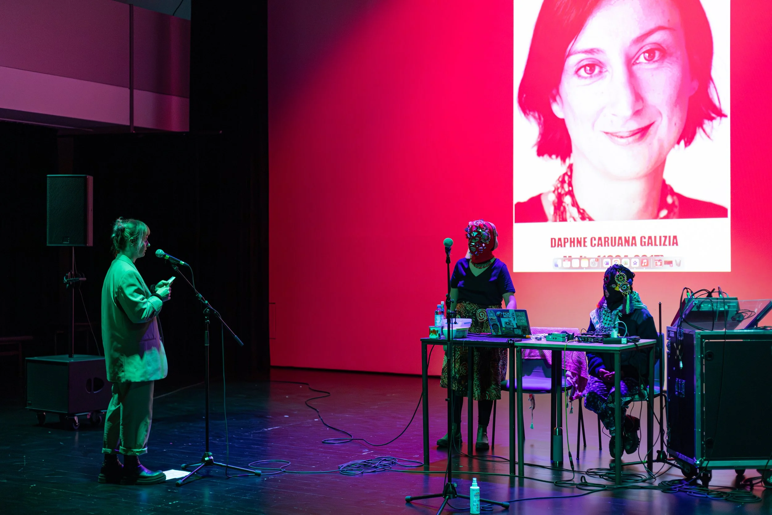 We weaved a choir of collective curses from within the heart of colonial-continuation institutions that call themselves ‘art’ academies. We had collected quotes from over 60 revolutionary figures, caretakers of Life in the past and present, as well as named their territories, from Panshin Beka to Sylvia Rivera. We asked the audience to join us, to read their quotes and give their breath into the microphone in exchange, to bury the dying heart of the empire, to disseminate new seeds over it, and to call the spirits and the words of our Warmi Pachakuti ancestors, through letting their words pass through our tongues and our bodies in the present. We collectively processed their resistance in our bodies, and continue with our presence into a long journey of screaming for the fall of the empire.