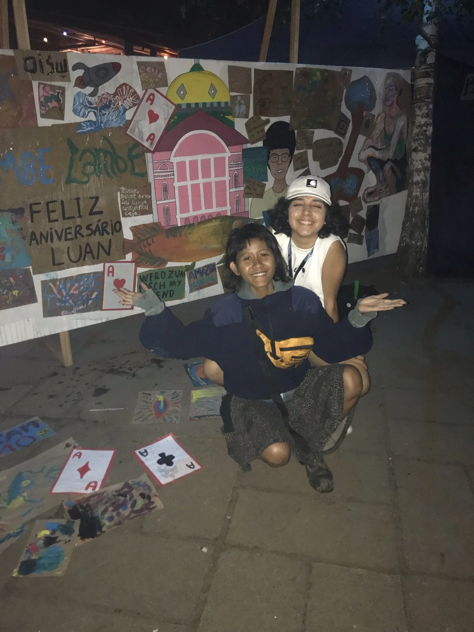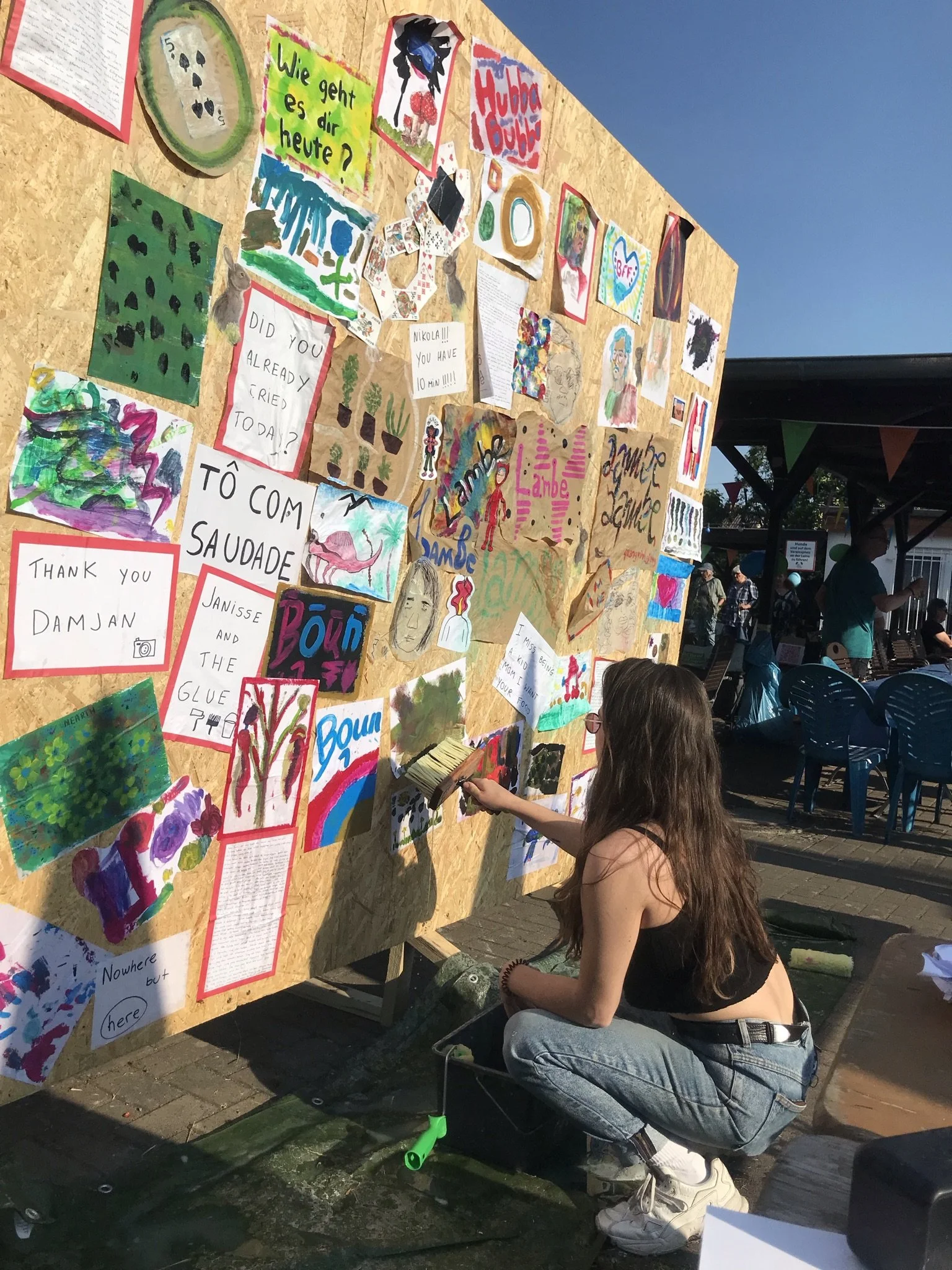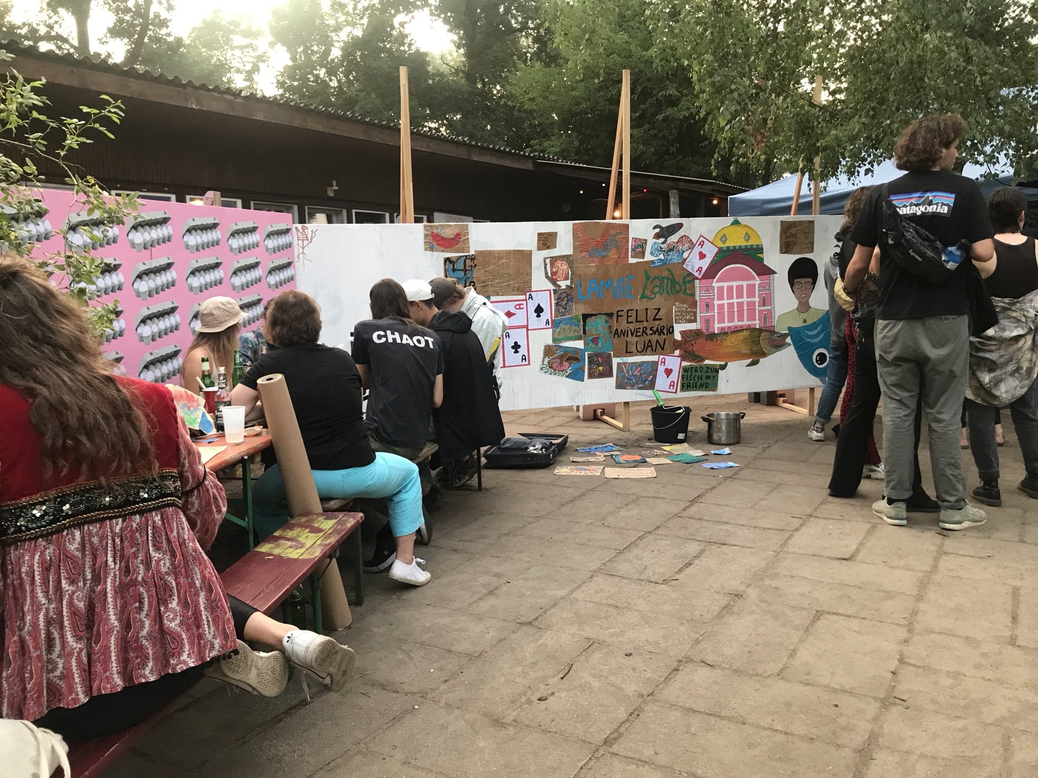 We also had the chance to create a Lambe Lambe workshop in the MitDir Music Festival in Brandenburg, Germany, 2023, where our crowd was festival visitors. It was a cozy and calm corner where people could take a rest from the festival ambiance, take a seat, paint or write, and let their “finished” or “unfinished” works join the growing collage on the wall.