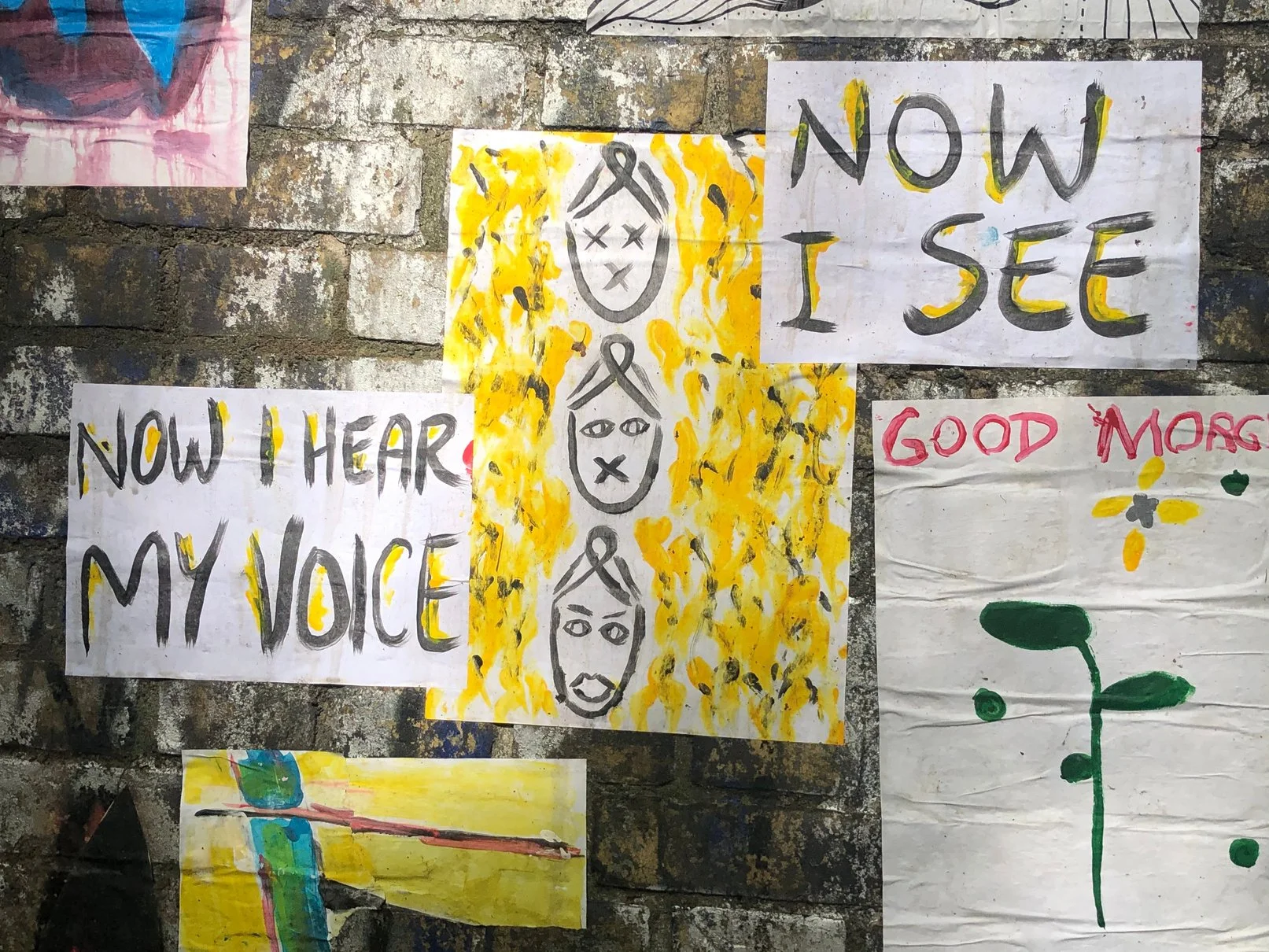 We invited participants to “cross the river” as a symbolic performative act to conquer their fears, and paste their work of self-expression on the wall adjoining the river. If they could not cross the river themselves, they were welcome to ask someone else to carry their artwork over and paste it for them.